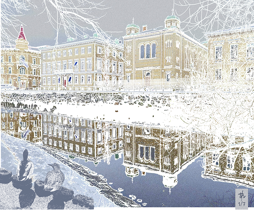 Av: Hilda Brümmer Synagogan i Göteborg, vinter; A3 kollage, Fine Art Print 1/7, A3 bildyta ca 21 x 17,4 cm
